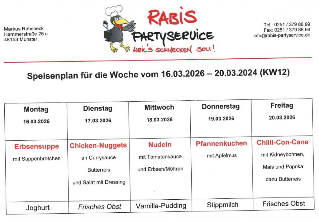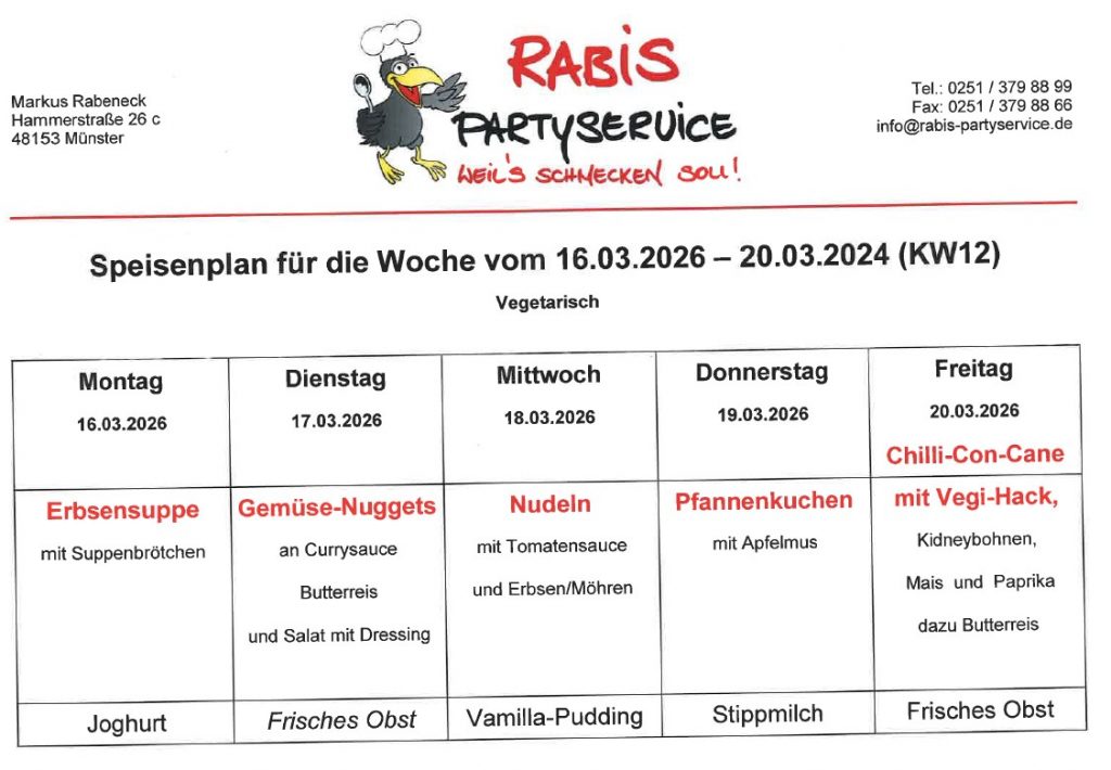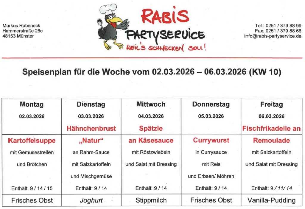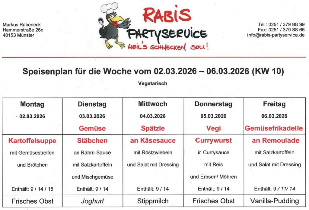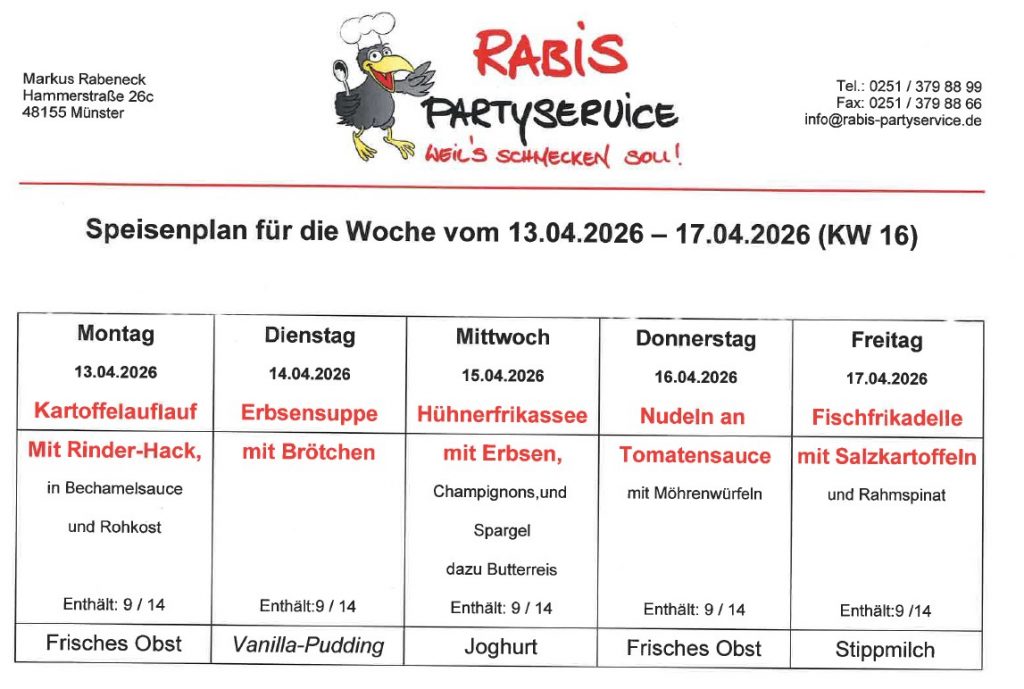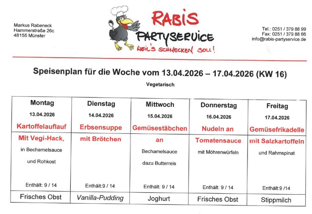 Mit dem Trägerwechsel zu SEHT e.V. Münster und dem Wechsel des Essensanbeiter zu Rabins, sind wir nun auch endlich in derLage, Ihnen den jeweils aktuellen Speiseplan zur Verfügung zu stellen. Der neue Caterer bietet täglich frisch zubereitetes Essen an, welches in vegetarischer sowie nicht-vegetarischer Form warm angeliefert wird.