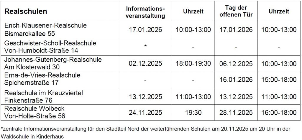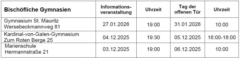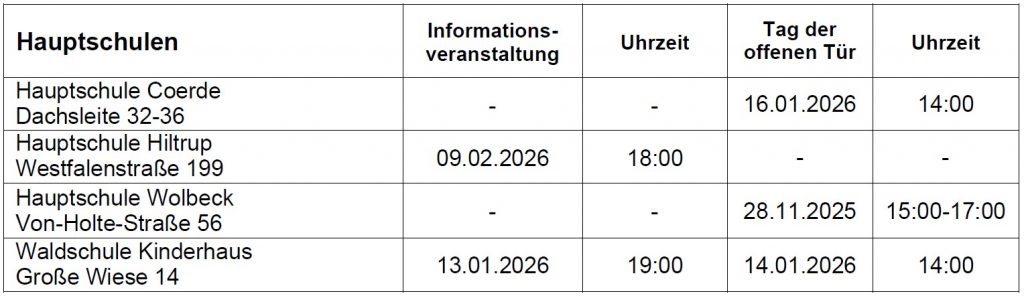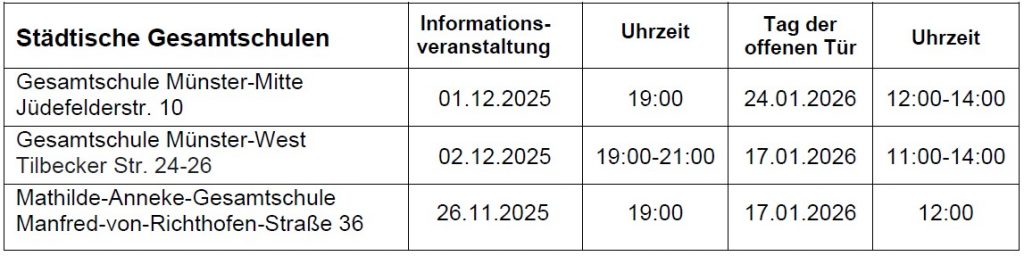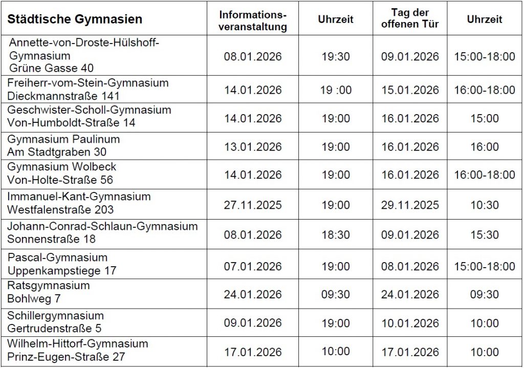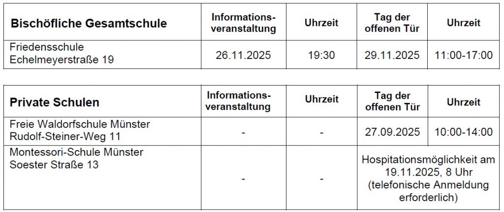 Hier die Termine der städtischen Schulen der Stadt Münster für den Übergang 2025/2026 :