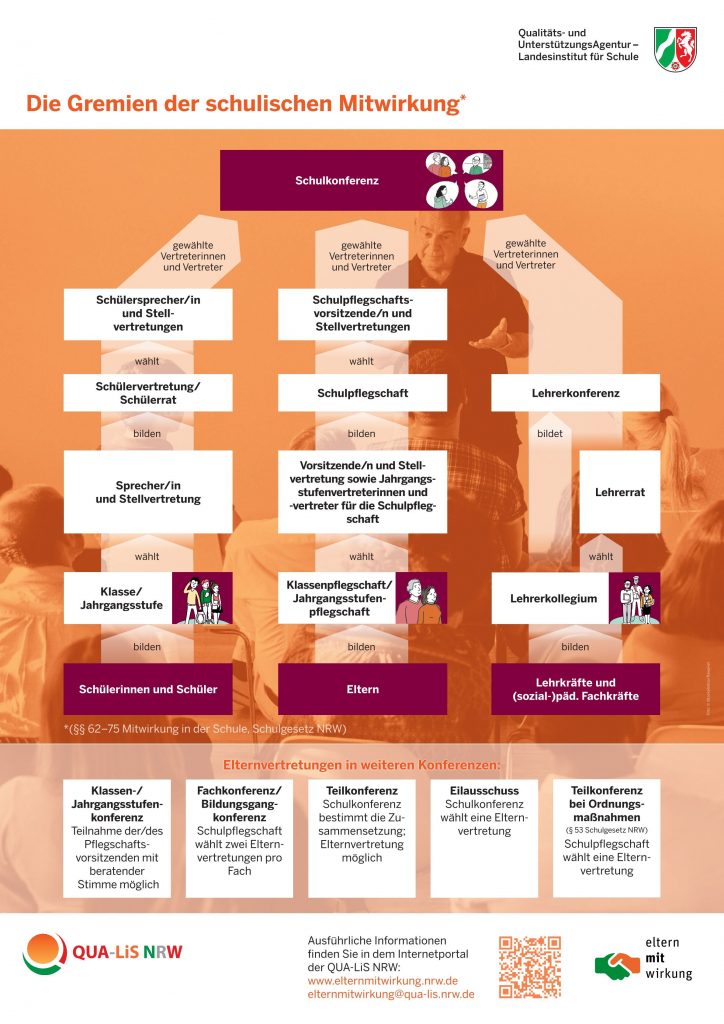 In der Broschüre “Elternmitwirkung” des Schulministeriums finden Sie weitere interessante Informationen. Ebenso auf der Seiten des NRW Bildungsportals. oder bei QUA-LIS NRW (der Qualitäts- und Unterstützungs Agentur NRW).