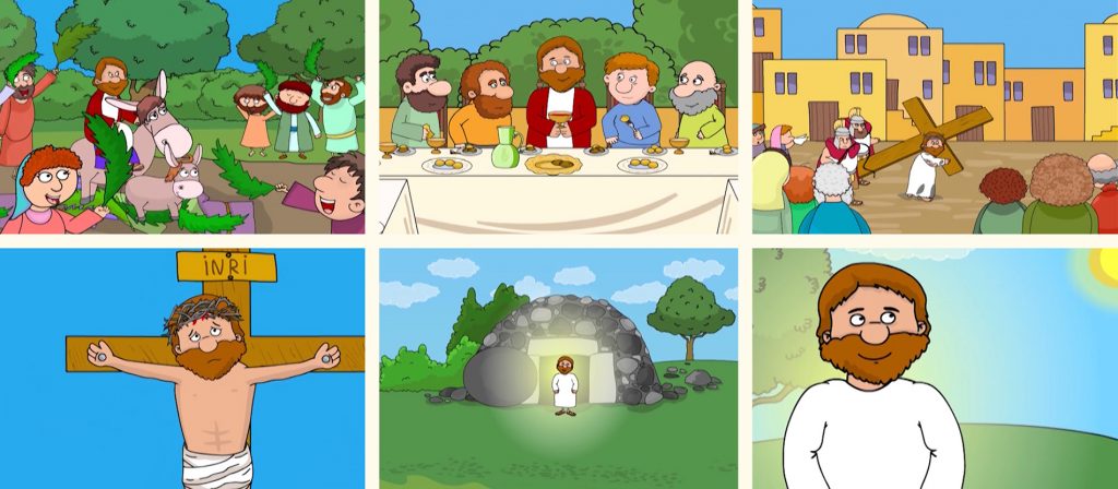 Jesus ist am Karfreitag gestorben, als Menschen ihn ans Kreuz geschlagen haben. Er wurde begraben in der finsteren Grabhöhle. Nach drei Tagen, am Ostermorgen, haben drei Frauen von seinen Freunden das leere Grab entdeckt. Hinter ihnen stand Jesus – auferstanden aus dem Tod, lebendig und leuchtend, was für ein Wunder!